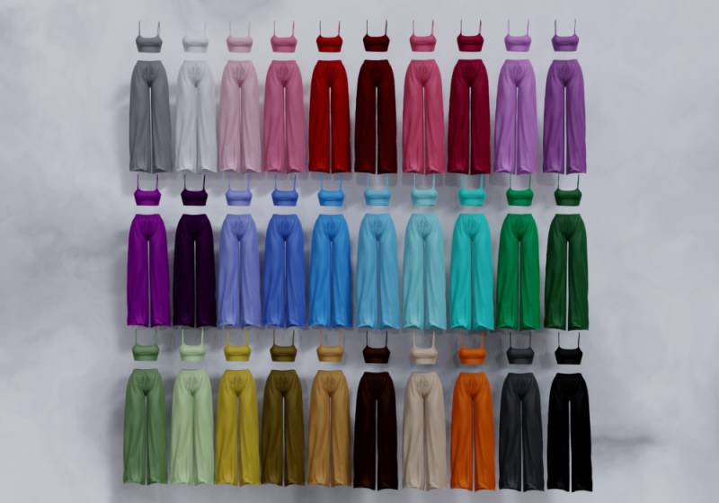 Женский наряд из топа и штанов в 10 разных цветовых образцах.